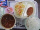 1年生はご飯と大缶が別盛になっているのに驚いていました。「どうして食べる?」「?」でした。