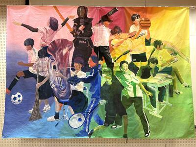道中部活動に参加するみなさんをモデルに美術部のみなさんが制作した絵画。道中プロジェクトでもお披露目されましたね。その作品が「みんなの絵画コンクール2025」において準グランプリを受賞しました。全国2位の快挙(かいきょ)です。おめでとうございます!美術部からメッセージをいただいています。紹介しますね。